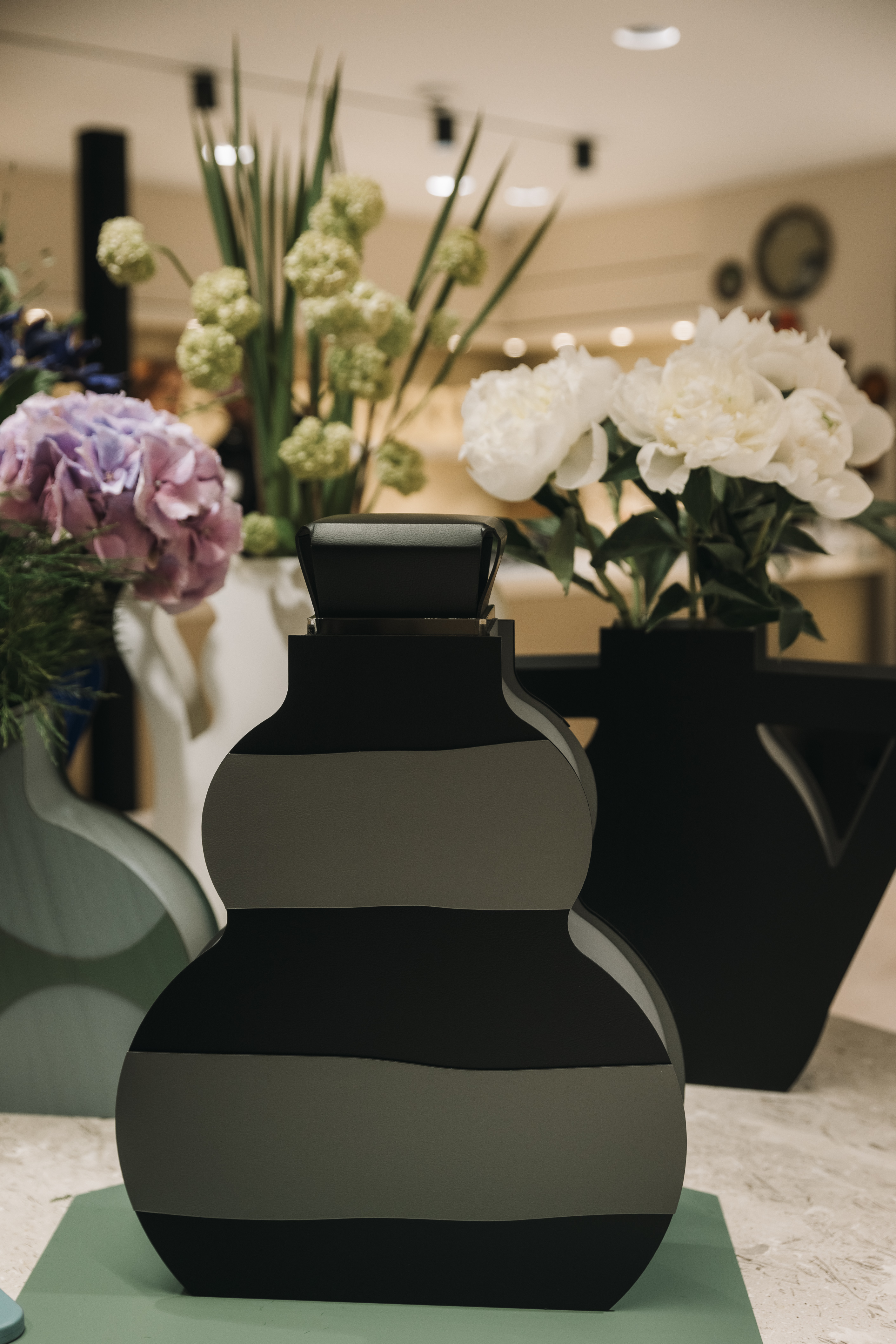 Благодаря использованию двухцветной кожи и мастерскому сложению в два слоя, вазы приобретают тактильную трёхмерность, рассказывая историю о живом сюжете картины в элегантной и изысканной форме.
