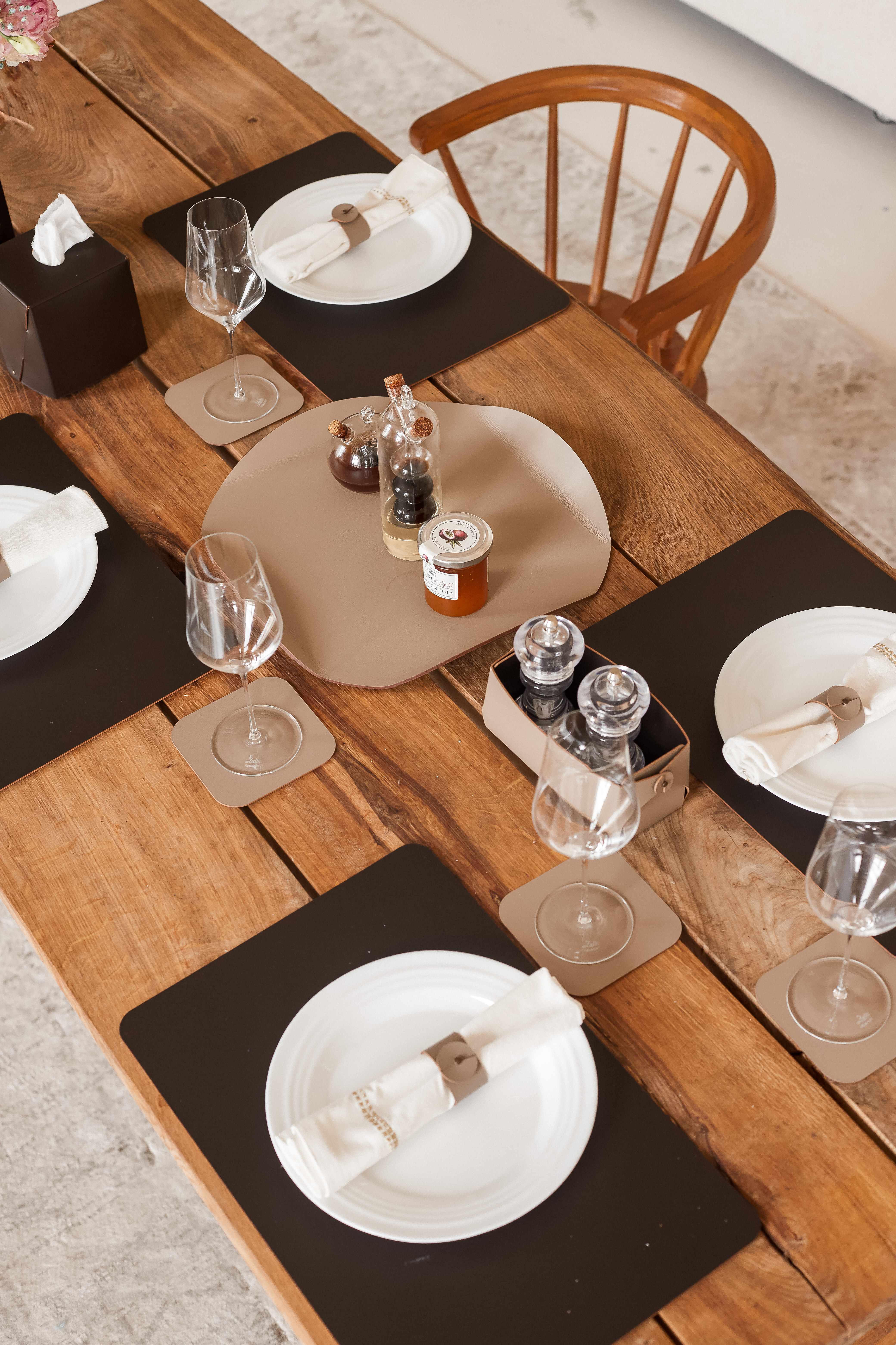 Плейсмат — эстетичная альтернатива скатерти. Двусторонняя окраска кожи расширяет цветовую гамму сервировки стола, а водоотталкивающая обработка защищает от появления пятен от масла, уксуса и соусов.
